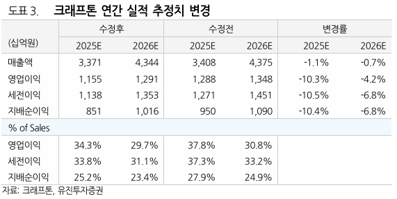 26년 실적 추정치 하향에 따라 목표주가를 330,000원으로 하향 조정하나 신작 기대감은 유효